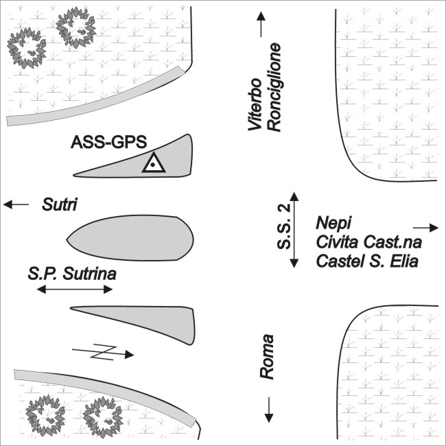 | materializzazione | Centrino in acciaio inox del tipo "GPS C", infisso al centro della piazzola spartitraffico a sinistra dell'incrocio venendo da Sutri. |