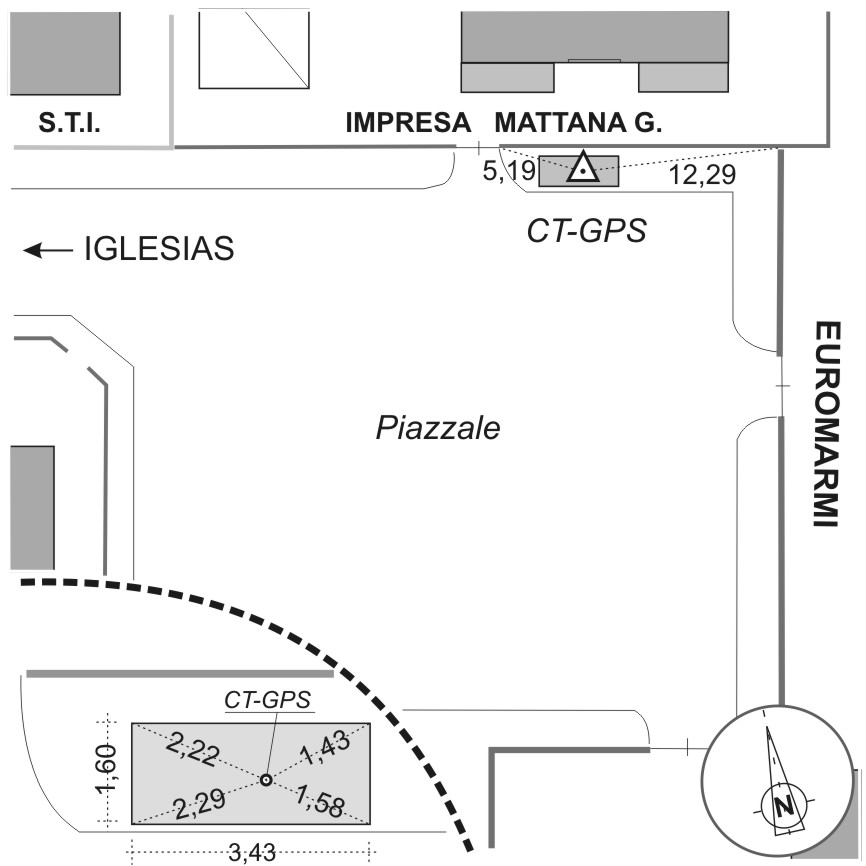 | materializzazione | Centrino in acciaio inox del tipo "GPS C" fissato sulla sommità del tombino fognario, a destra dell'ingresso all'Officina Mattana Giovanni, nella Zona Industriale Sa Stoia presso l'officina "G.Matanna" ad est di Iglesias. |