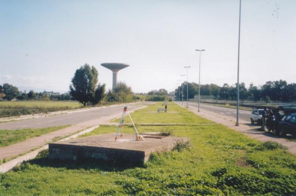Centrino in acciaio inox del tipo "GPS C" fissato sulla sommità e al centro del tombino del collettore fognario, nell'aiuola prospiciente al civico n°131 del Viale della Repubblica, nella periferia ovest di Oristano.