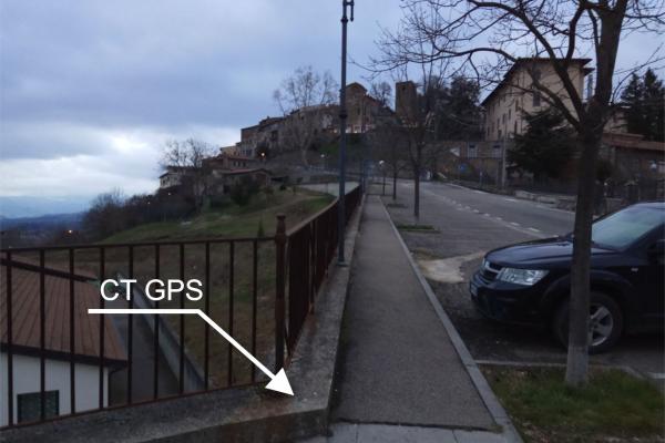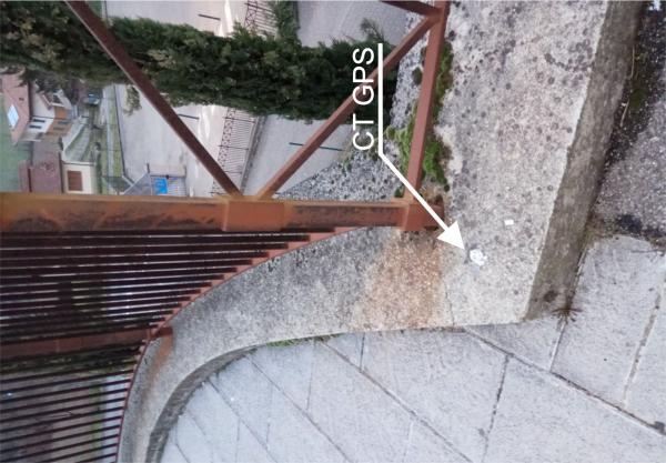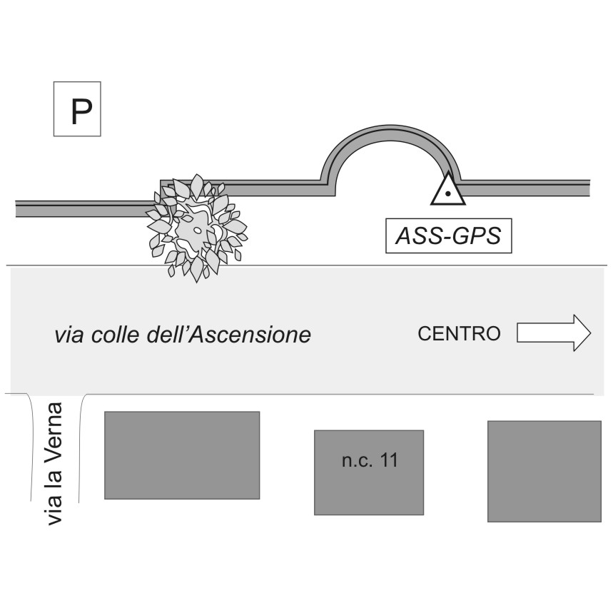 Centrino del tipo "GPS D" infisso sulla sommità del muro a retta, sul quale è stata ancorata una ringhiera a lato di via colle dell'Ascensione, in corrispondenza dello spigolo formato con una sporgenza di forma semicircolare antistante il n° civico 11.