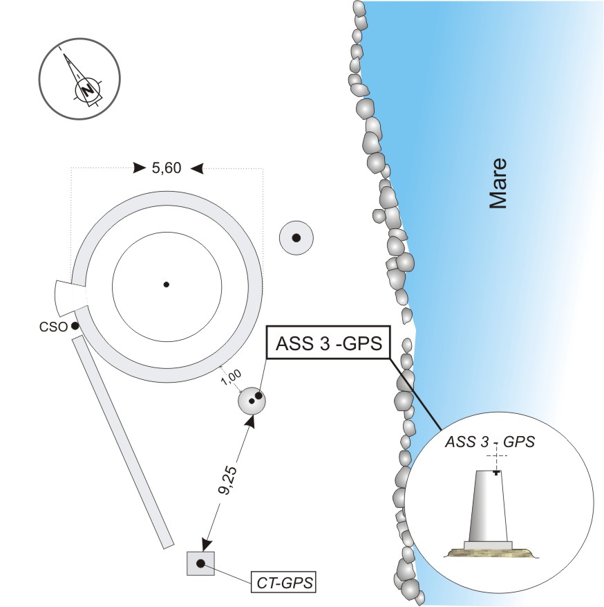 | materializzazione | Dado avvitato su filettatura 5/8 cementata sul pilastrino tronco-conico sito in prossimità del casotto facente parte del poligono per il Controllo Geodetico dello Stretto di Messina. |