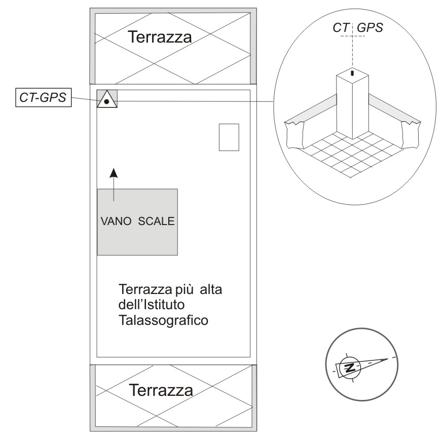 | materializzazione | Piastra in acciaio munita di vite autocentrante, protetta da un tappo in acciaio, cementata alla sommità del pilastrino in cemento armato ubicato nello spigolo sud-ovest della terrazza più alta dell'istituto Talassografico. Il vertice fà parte del poligono materializzato dall'IGM per il "Controllo Geodetico dello Stretto di Messina" (vertice n°4). |