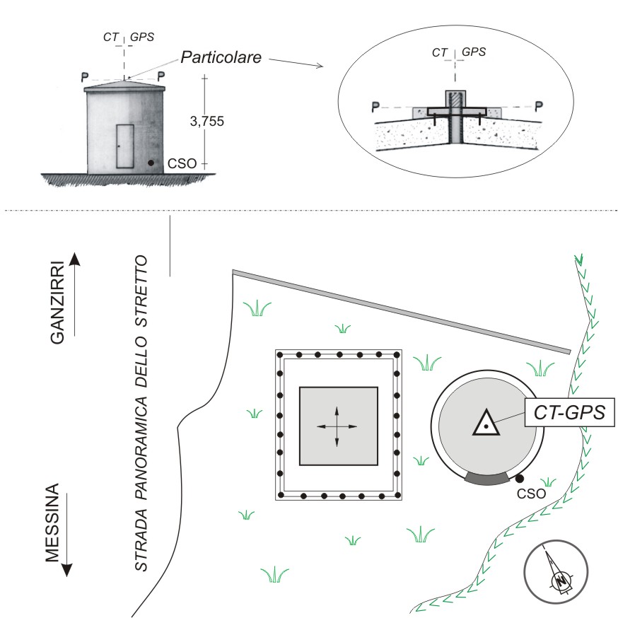 | materializzazione | Piastra in acciaio munita di vite autocentrante, protetta da un tappo in acciaio, cementata sulla soletta di copertura del casotto a pianta circolare, facente parte del poligono materializzato dall'IGM per il "Controllo Geodetico dello Stretto di Messina" (vertice n°5). Il casotto è ubicato lungo la strada panoramica dello Stretto. |