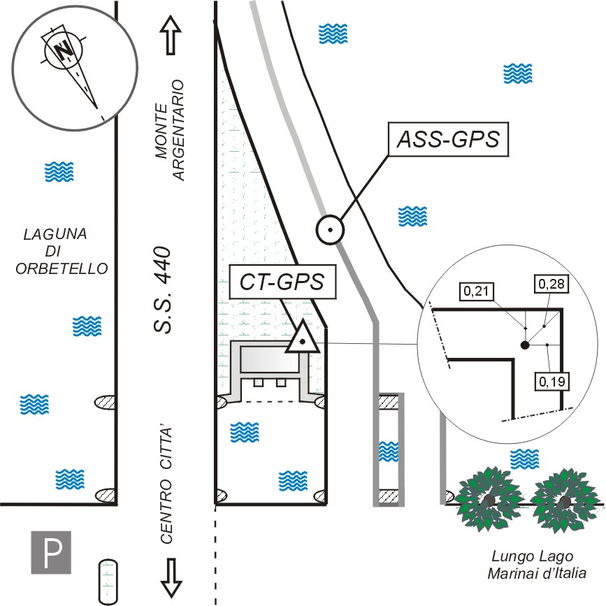 | materializzazione | Centrino in acciaio inox del tipo " GPS C " infisso sul cordolo in cemento dell' idrovora. |