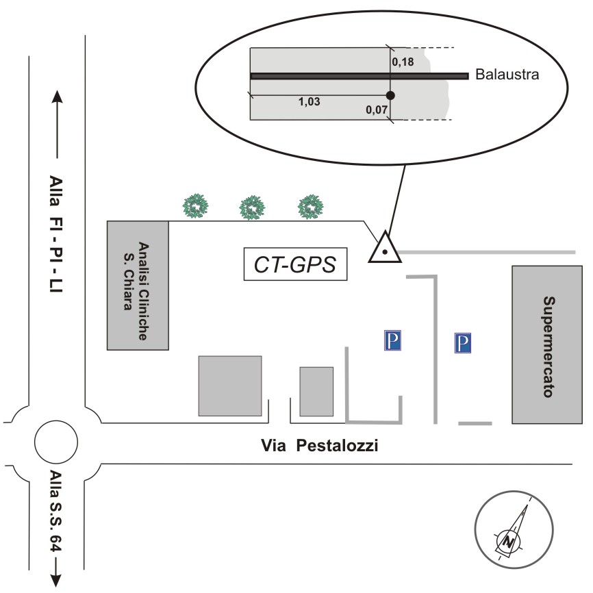 | Materializzazione | Centino in accaio inox del tipo GPS da livellazione infisso alla sommità ed estremo ovest del muretto in cemento armato, lato campi, che delimita la rampa di accesso pedonale fra i due posteggi. |