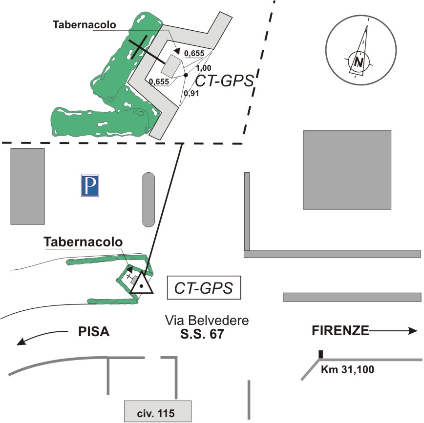 | Materializzazione | Centrino in acciaio inox del tipo GPS da livellazione fissato sul basamento in cemento armato antistante il tabernacolo. |