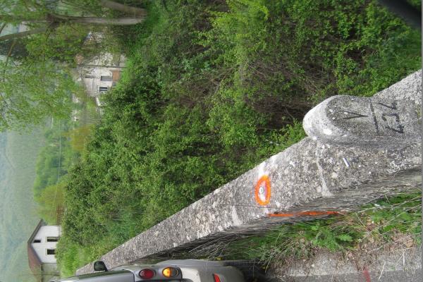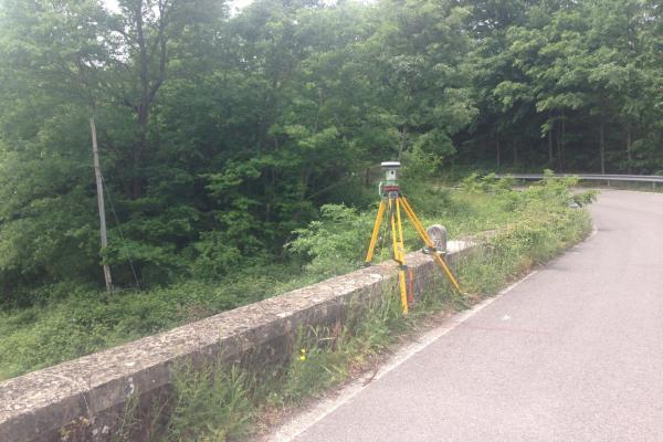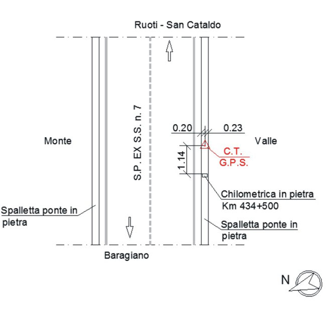 | materializzazione | Centrino metallico orizzontale di tipo chiodo con rondella ARPAB Regione Basilicata infisso sulla testa della spalletta ponte, lato valle, in corrispondenza del pilone centrale di sostegno. |