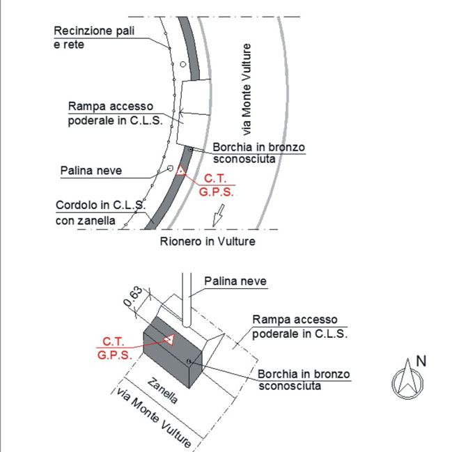 | materializzazione | Centrino netallico orizzontale di tipo chiodo con rondella ARPAB Regione Basilicata infisso sulla testa del cordolo in calcestruzzo. |