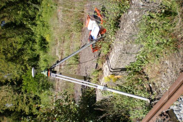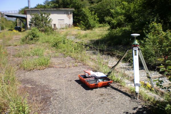 | materializzazione | Centrino metallico orizzontale di tipo chiodo con rondella ARPAB Regione Basilicata infisso sul muro di contenimento binario secondario stazione Monticchio in disuso. |