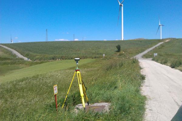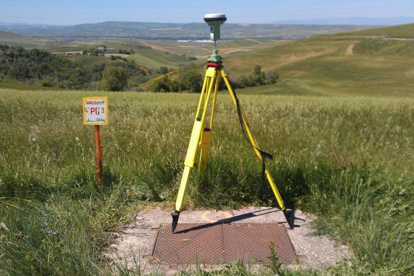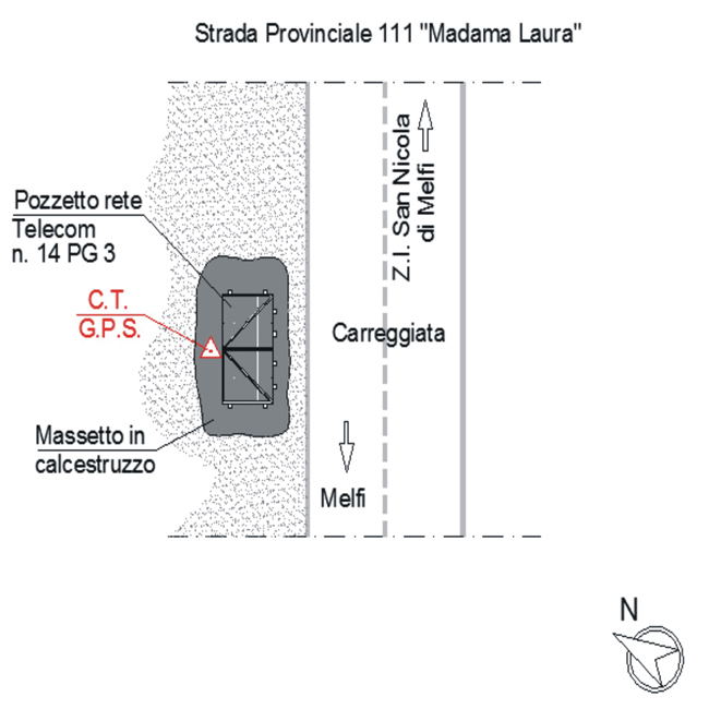 | materializzazione | Centrino metallico orizzontale di tipo chiodo con rondella ARPAB Regione Basilicata infisso su massetto in calcestruzzo pozzetto rete Telecom n. 14 PG 3. |