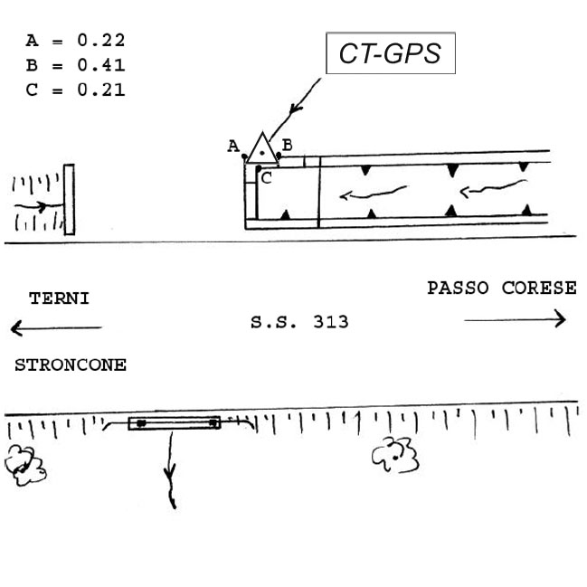 | materializzazione | Centrino metallico infisso sullo spigolo nord del cordolo del tombino in calcestruzzo, al Km 47+800 della S.S. 313 di Passo Croce. |