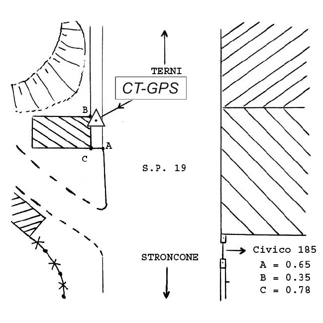 | materializzazione | Centrino metallico infisso sulla sommità del muro di sostegno in calcestruzzo, lato sud, della S.P. 19 Collescipolana, al Km 1+750 circa, in località Madonna del Colle, a Collescipoli. |