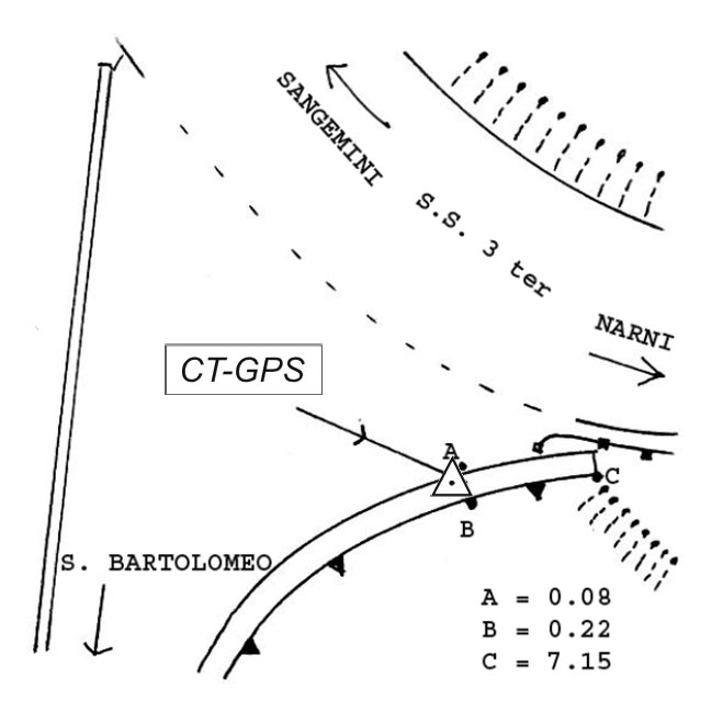 | materializzazione | Centrino metallico infisso sulla sommità del muro di sostegno in calcestruzzo, al km 15+200, a valle della S.S. 3 ter, in prossimità dell'accesso al Podere San Bartolomeo. |