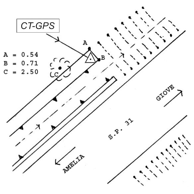 | materializzazione | Centrino metallico infisso sull'estremità sud del muro di sostegno in calcestruzzo a monte della S.P. 31, al km 7+500, in località Podere Paradiso. |