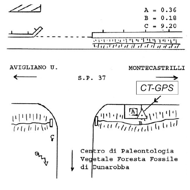 | materializzazione | Centrino metallico infisso sullo spigolo sud-est del pozzetto della fognatura in calcestruzzo lungo la S.P. 37, al Km 3+400 circa, nei pressi dell'ingresso al Centro di Paleontologia Vegetale della Foresta Fossile di Dunarobba. |