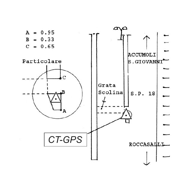 | materializzazione | Centrino metallico infisso sulla sommità del muro di sostegno al Km 11+600 della S.P. 18, in località Terracino. |