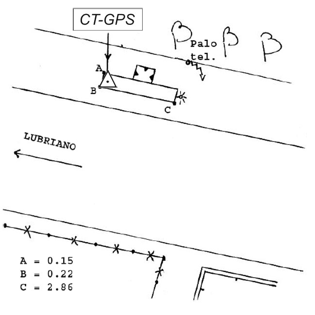 | materializzazione | Centrino metallico infisso sullo spigolo nord-ovest del cordolo del tombino lungo la strada che da Vaiano conduce a Lubriano. |