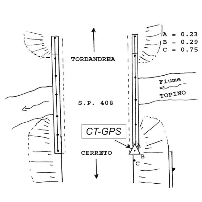 | materializzazione | Centrino metallico infisso sulla sommità della spalla sud-est del ponte in calcestruzzo della S.P. 408 di Tordandrea sul fiume Topino, al km 5+200 circa, 200 metri a nord dell'abitato di Cerreto. |