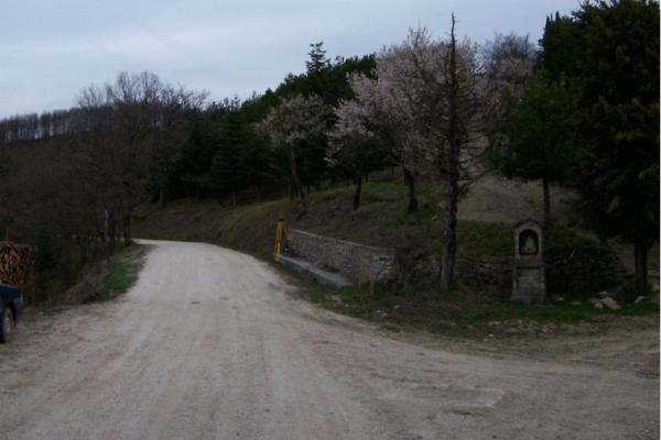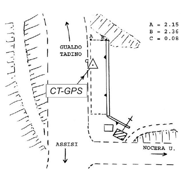 Centrino metallico infisso sulla sommità della fondazione in calcestruzzo, lato nord, del muro di sostegno in pietra a monte della strada, nei pressi dell'incrocio per Nocera Umbra, in località Bandita Cilleni.