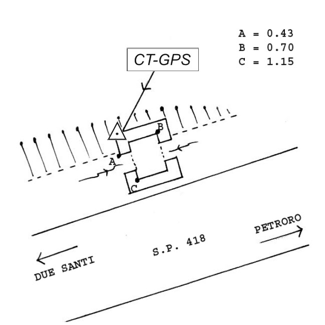 | materializzazione | Centrino metallico infisso sullo spigolo nord – ovest del tombino in calcestruzzo della S.P. 418, al km 3 + 900. |