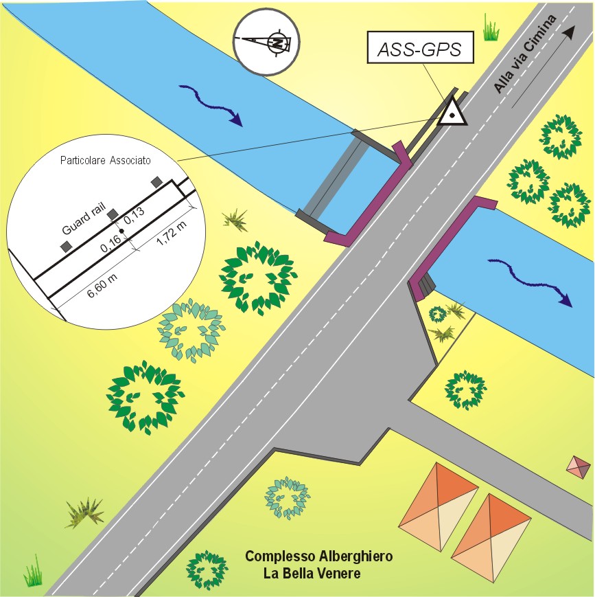 | materializzazione | Centrino in acciaio inox del tipo "GPS D" infisso nel cordolo antistante il guard-rail, in corrispondenza del secondo pilone, a nord del ponticello, ubicato a nord-est dell'ingresso del Complesso Alberghiero "La Bella Venere" |