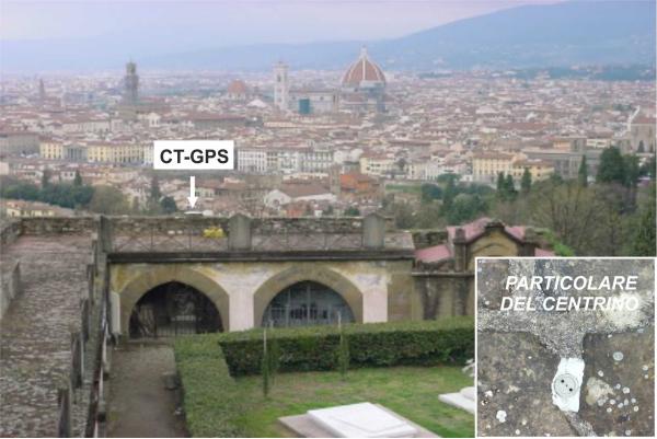 Centrino in acciaio inox del poligono di taratura strumentale dell'IGM infisso sulla testa del muro in pietra di sostegno delle cappelle del cimitero monumentale di San Miniato al Monte.