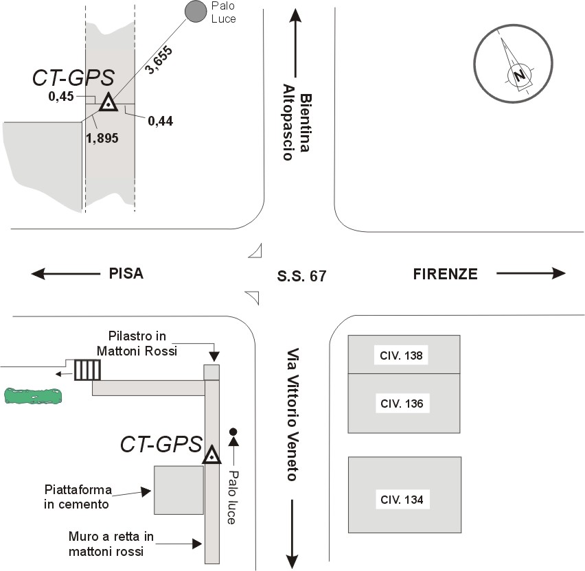 Centrino in acciaio inox del tipo GPS da livellazione infisso alla sommità di un grosso muro di contenimento in mattoni, posto in via Vittorio Veneto all'altezza dei civici 134-136 .