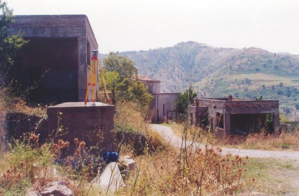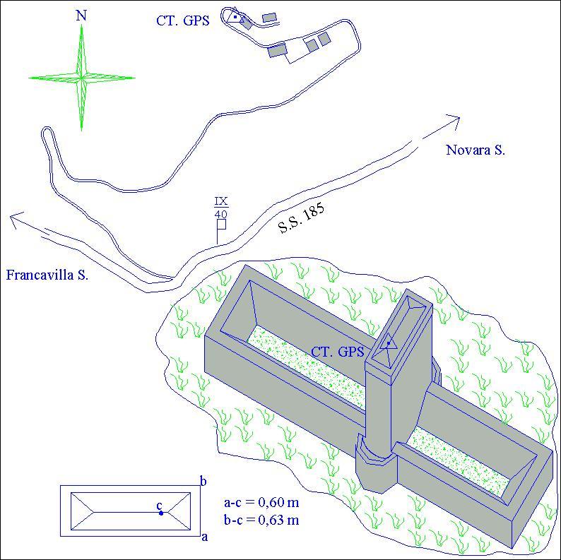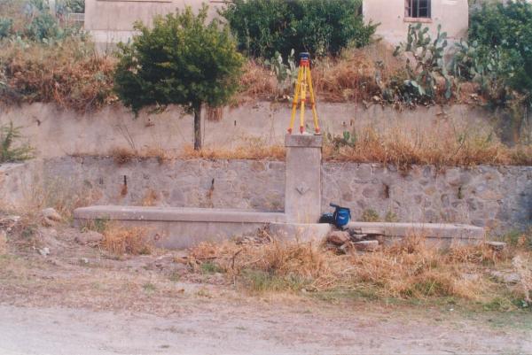 Centrino in acciaio inox del tipo GPS da livellazione infisso lungo la linea di colmo nella testata del corpo centrale in calcestruzzo di una fontana situata lungo i margini di una stradella interpoderale che dalla S.S.185 conduce a Piano Torre.