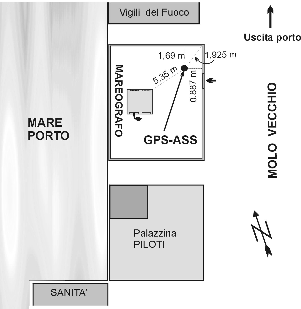 | materializzazione | Centrino in acciaio inox del tipo "GPS D" infisso in corrispondenza dello spigolo Nord-Est della pavimentazione del terrazzo del Mareografo di Catania sistuato al Molo Vecchio. |