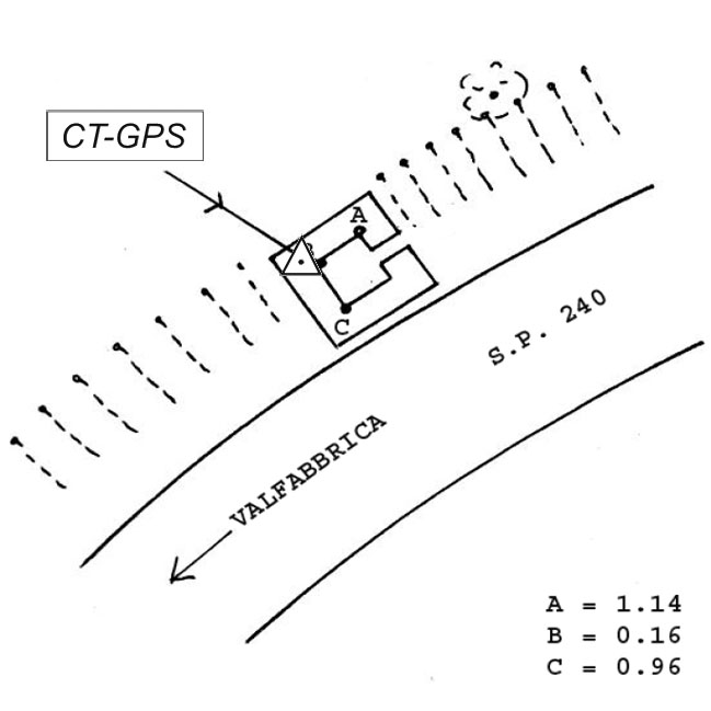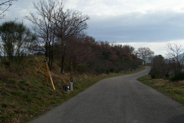 Centrino metallico infisso sullo spigolo nord-ovest del tombino in calcestruzzo a monte della S.P. 240, in località Poggio San Dioniso.