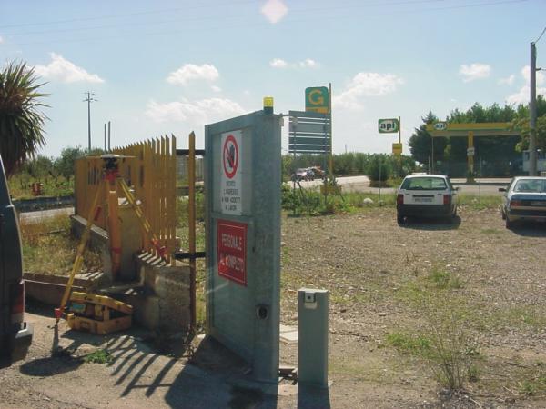 Centrino in acciaio inox del tipo "GPS da livellazione" infisso all'estremità della recinzione sul cordolo di fondazione in calcestruzzo, presso il cancello di accesso della Ditta Intercantieri (vendita materiali edili).