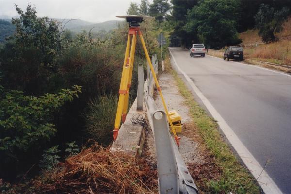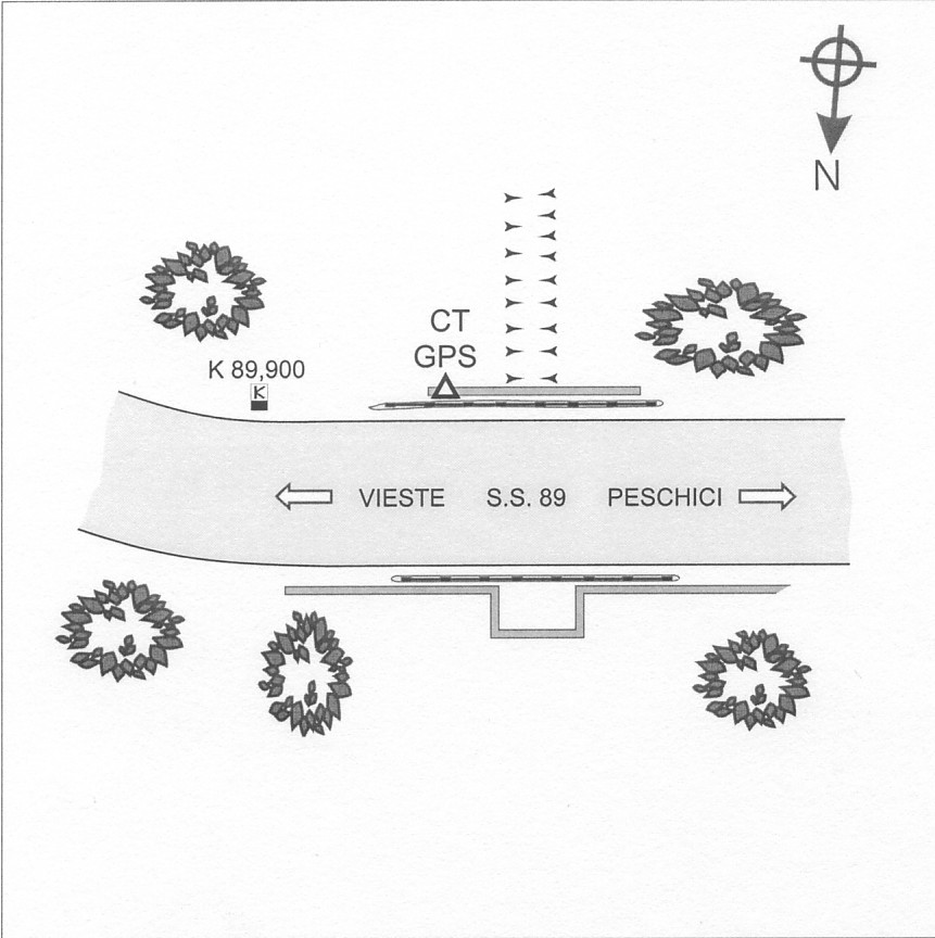 Centrino in acciaio inox del tipo "GPS da livellazione" infisso presso l'estremo est del cordolo in cemento sopra il canale di scolo, al Km 89,890 della S.S. 89.