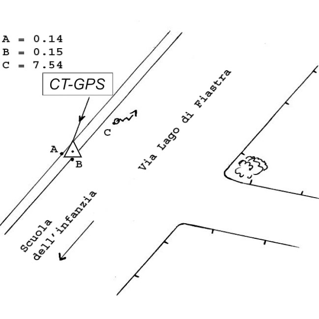 | materializzazione | Centrino metallico infisso sulla sommità, pressochè in mezzeria, del muro in calcestruzzo di delimitazione di Via Lago di Fiastra, di fronte al civico 12, nei pressi della scuola per l'infanzia, a Budino. |