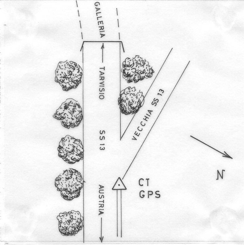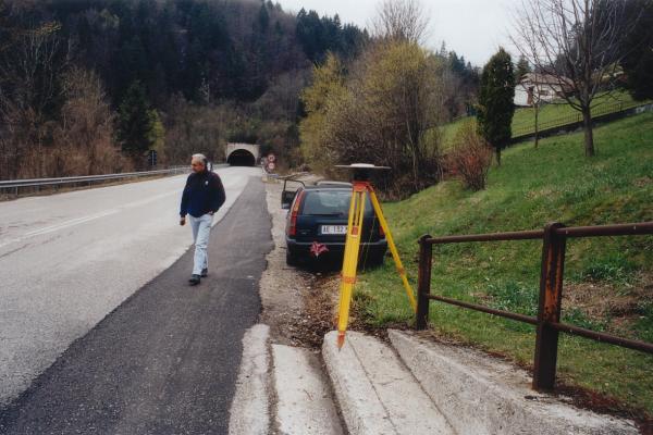 | materializzazione | Chiodo in acciaio inox a testa semisferica fissato sul cordolo del muretto armato sul lato sinistro della S.S. 13 subito fuori la galleria. |
