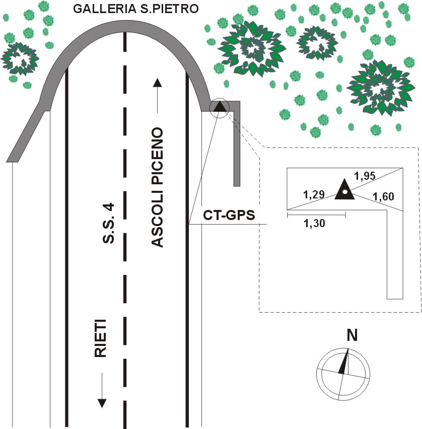| materializzazione | Centrino in acciaio inox del tipo "GPS C" infisso sulla spalla destra, direzione Ascoli, della galleria S. Pietro. |