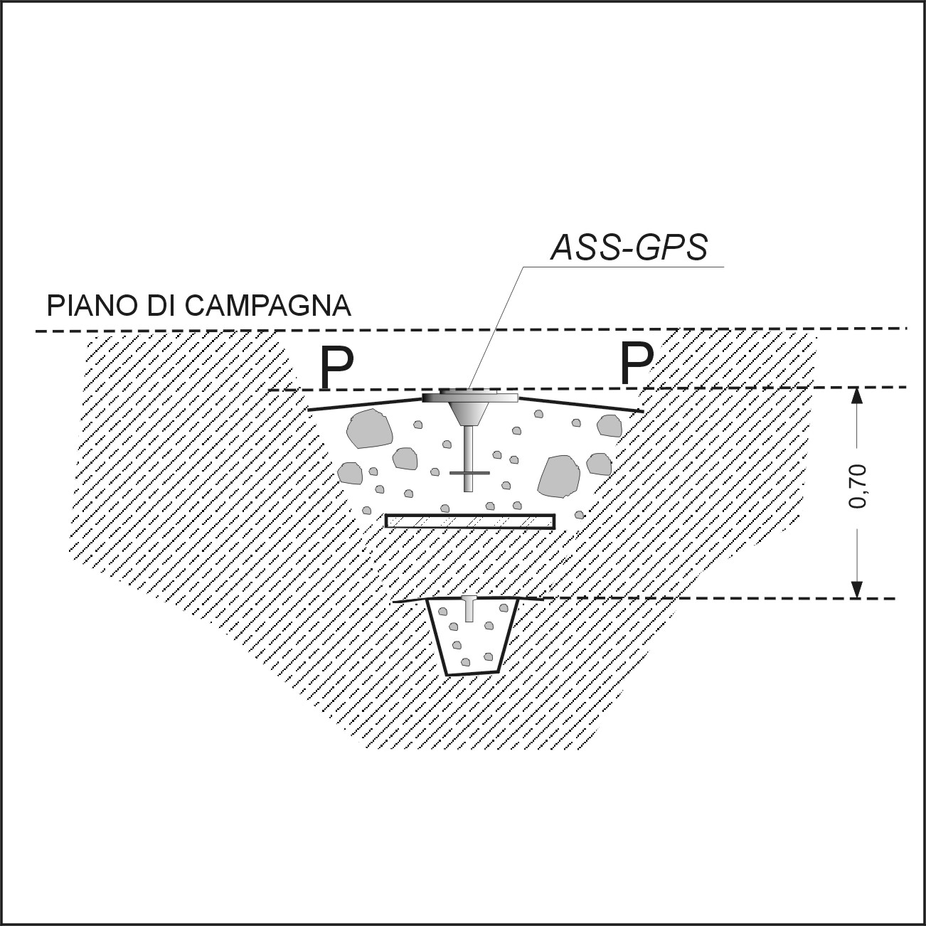 | materializzazione | Centrino del tipo "GPS B" incollato sul presistente centrino IGM del tipo di superficie in blocco di calcestruzzo in asse al sottostante centrino di fondo in vetro. |