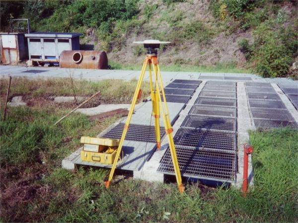 Centrino in acciaio inox del tipo "GPS da livellazione" fissato sul cordolo in cemento di una vasca idrica, a margine della strada.