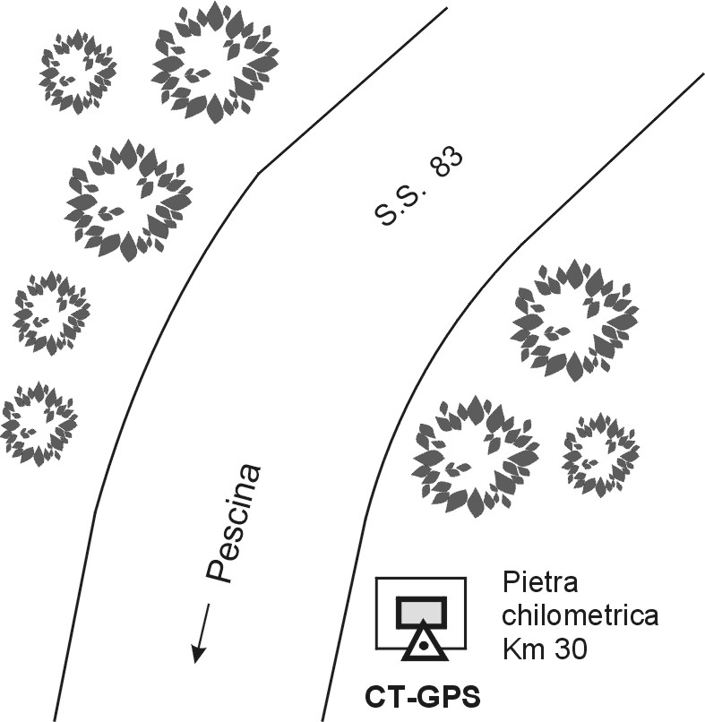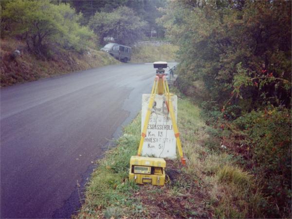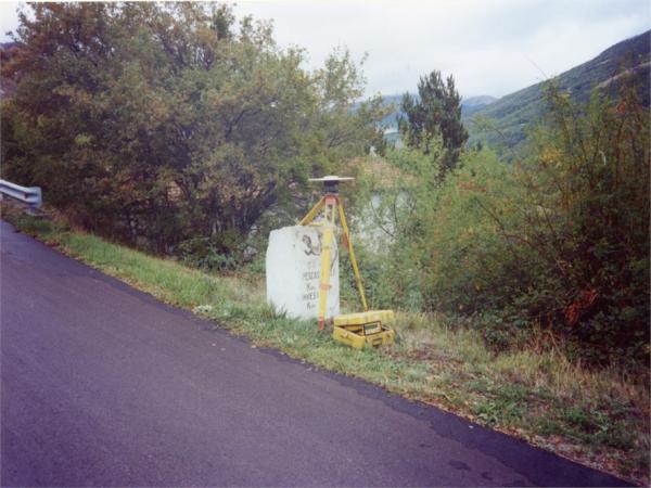 | materializzazione | Centrino in acciaio inox del tipo "GPS da livellazione" infissato sul basamento in cemento della pietra chilometrica del km 30,000. |