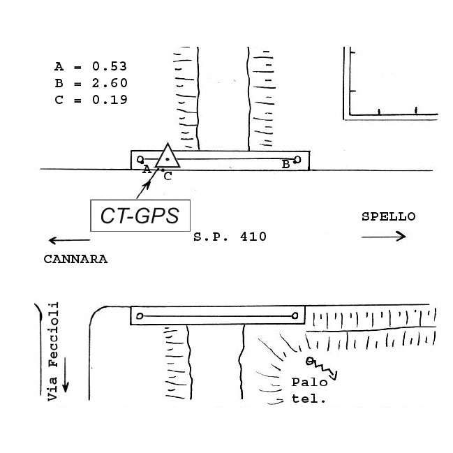 | materializzazione | Centrino metallico infisso sullo spigolo nord-ovest del tombino in calcestruzzo della S.P. 410 di Cannara, sul fosso, al km 3+400 circa, in località Torre Quadrano. |