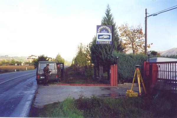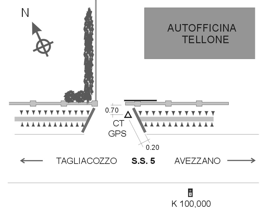 | materializzazione | Centrino in acciaio inox del tipo "GPS da livellazione" infisso nella massicciata in cemento antistante il cancello di ingresso dell' "Autofficina Tellone", all'altezza del Km 99,950 della S.S 5, due Km circa a est di Tagliacozzo. |