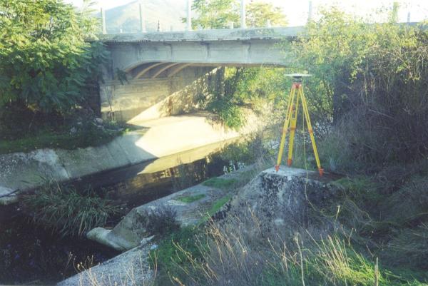 Centrino di acciaio inox del tipo "GPS da livellazione" infisso sulla sommità della briglia del fiume Rafia, riva destra, presso il ponte della S.S 5.