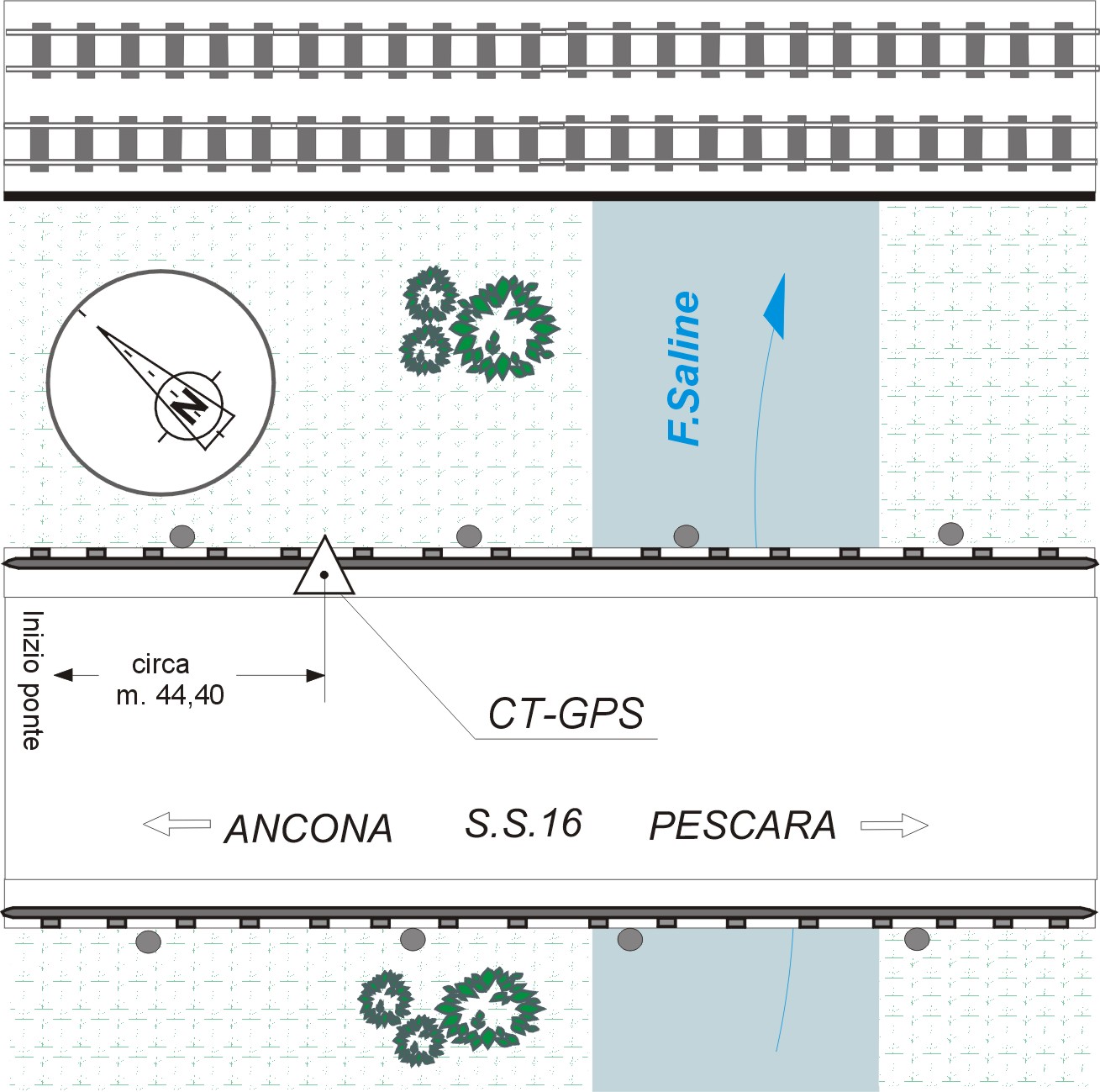 | materializzazione | Centrino del tipo GPS C fissato sul cordolo in cemento del ponte sul fiume Saline. |