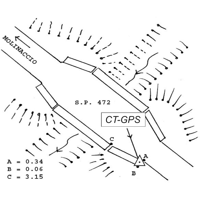 | materializzazione | Centrino metallico infisso sulla spalla sinistra, spigolo sud, del ponticello in calcestruzzo sul torrente al km 15+300 della S.P. 472, in località Molinaccio. |