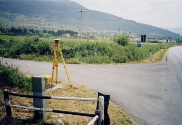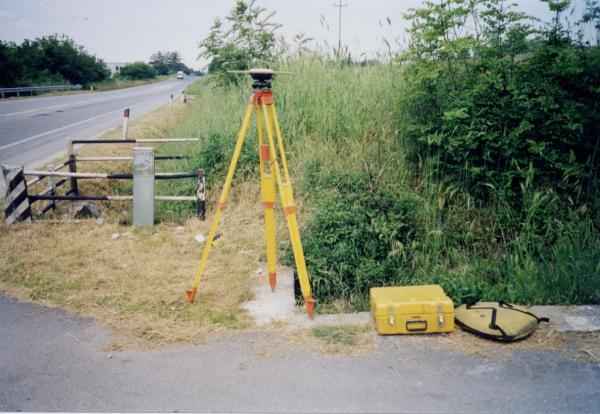 | materializzazione | Centrino in acciaio inox del tipo "GPS da livellazione" fissato su cordolo in cemento dii canaletto di raccolta acque, a margine della strada. |