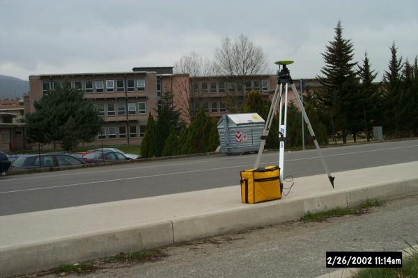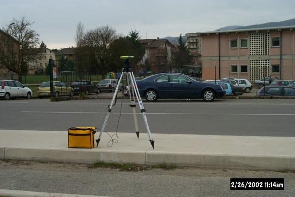 Centrino GPS in acciaio inox del "tipo D" posizionato sul marciapiede in calcestruzzo ubicato a nord-est dell'istituto tecnico per geometri, appena fuori della recinzione dello stesso.