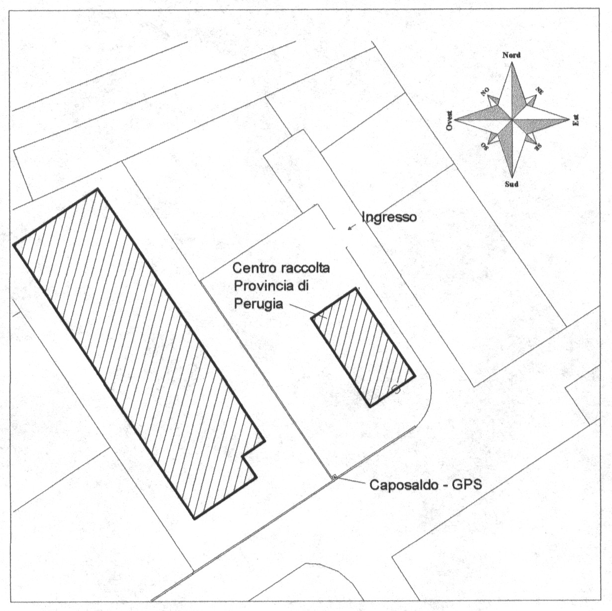 | materializzazione | Centrino GPS in acciaio del tipo autocentrante filettato su pilastro in cemento armato gettato in tubo in pvc di colore bianco posto sull'angolo sud della recinzione dell'area di pertinenza del Centro di raccolta in località Pasciana. |