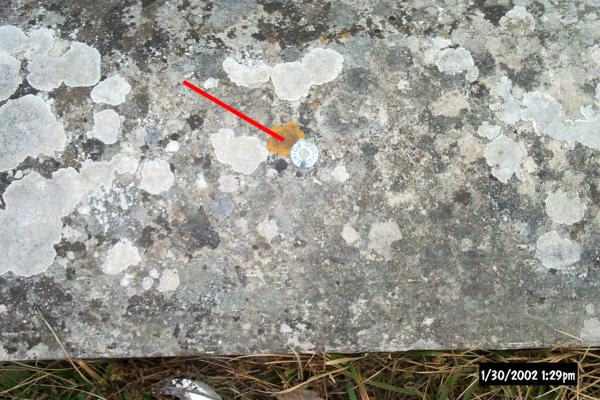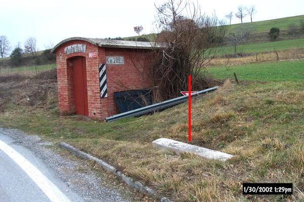 Chiodo topogafico in acciaio posizionato su cordolo in calcestruzzo a protezione di un pozzetto situato sul lato destro della SS 3 Flaminia.