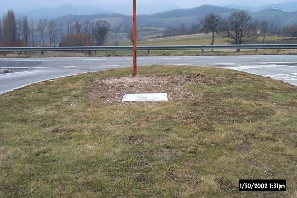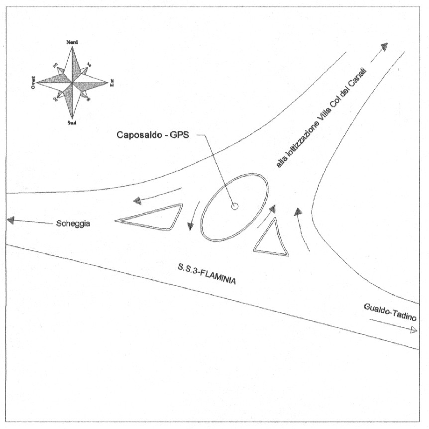 Chiodo topografico con rondella in ottone con scritta "Provincia di Perugia", posta su basamento in calcestruzzo a base quadrangolare. Il caposaldo è posizionato all'interno dell'aiuola spartitraffico centrale dell'incrocio che dalla nuova lottizzazione di Villa Col dei Canali conduce alla SS 3 Flaminia.
