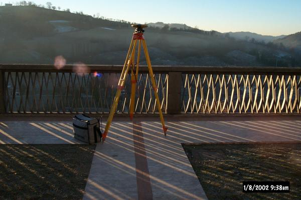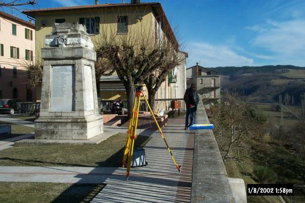Chiodo topografico con rondella in ottone, con scritta "Provincia di Perugia" fissato sulla riga a mattoni al centro del marciapiede che dalla strada conduce perpendicolarmente al parapetto d'acciaio del belvedere dei giardini pubblici. Il centrino è a sud del monumento ai "Caduti per la Patria".