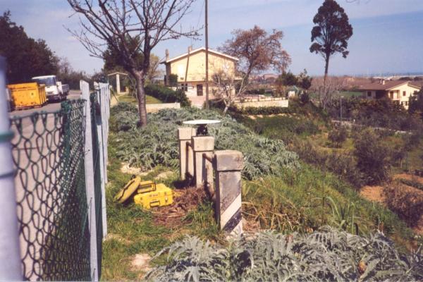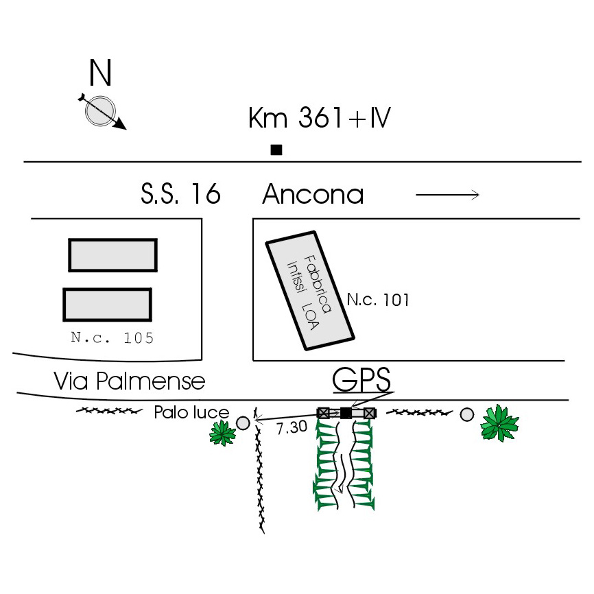 | materializzazione | Centrino in acciaio inox del tipo "GPS da livellazione" infisso nella sommità del pilastrino centrale del parapetto del ponticello che attraversa il fosso a lato della fabbrica di infissi "LOA" ubicata in Via M. Palmense n.civ.101, strada parallela alla S.S.16. |